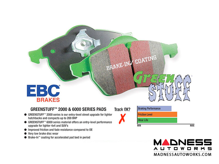 Designed for premium street driving. Offering better brake effect up to 600°C (1100°F). EBC Greenstuff brake pads have a high initial brake effect and give drivers confidence from first application of the brake pedal.