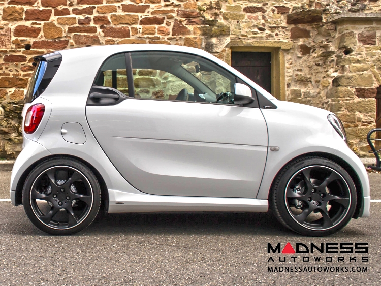 Front Spoiler, Side Skirts, Rear Bumper, Custom Wheels, Performance Springs, Performance Exhaust, Interior Accessories and an Engine Performance Module designed to significantly increase the performance of the 453 smart.